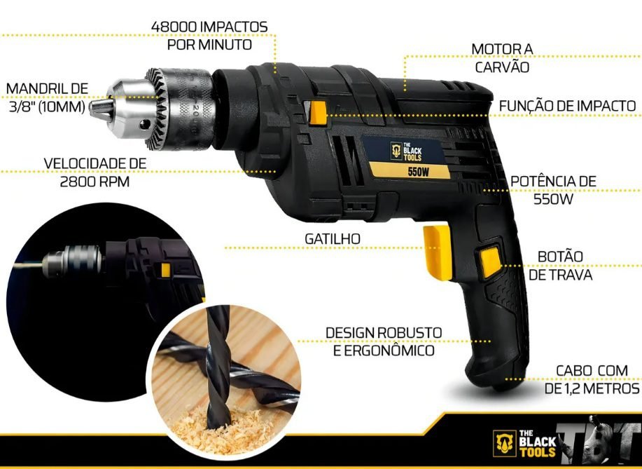 FURADEIRA COM IMPACTO 3/8″ 10MM 550W TBF550 – The Black Tools